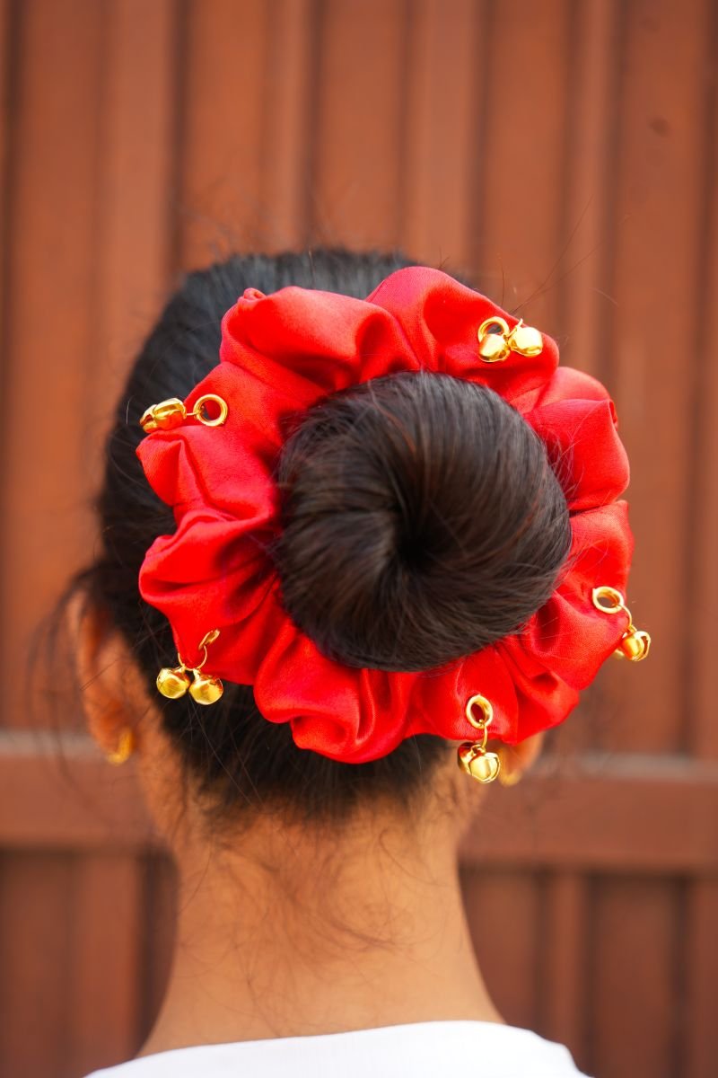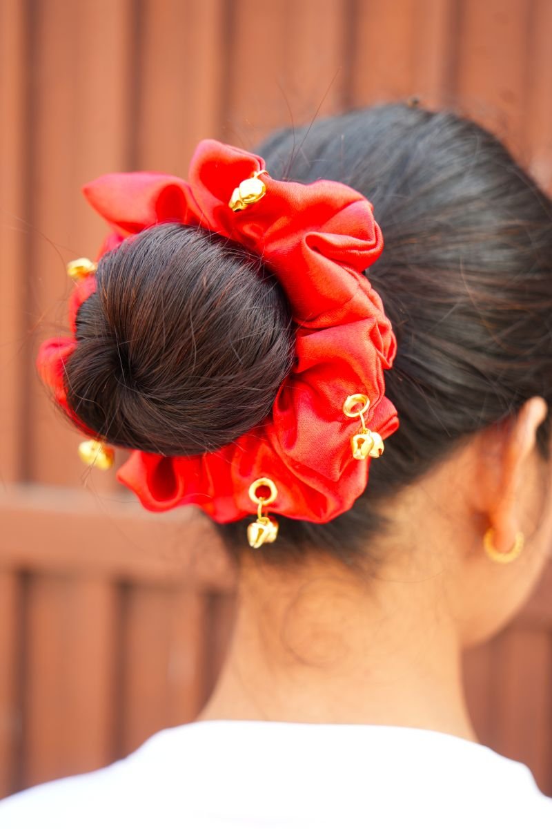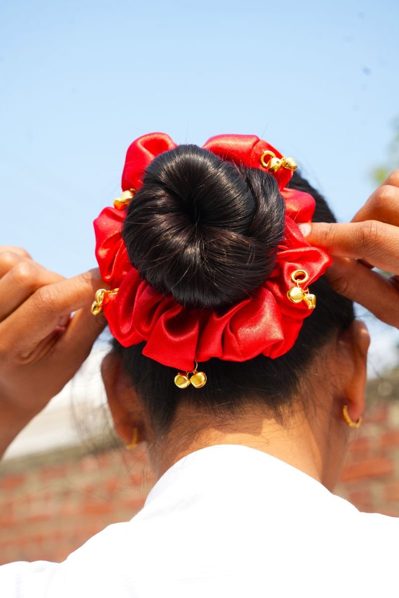 • Flaunt your gorgeous hair with our beautifully handcrafted Red Ghungroo Scrunchie M-Size.